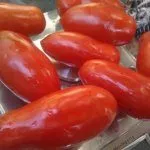 Плоды имеют цилиндрическую форму, с легкой ребристостью. Томаты не большие – около 60 г, имеют практически одинаковый размер. Аромат и вкус хороший – плоды сладко-кислые, мякоть нежная и плотная. Поверхность плодов блестящая и гладкая, плотная структура.