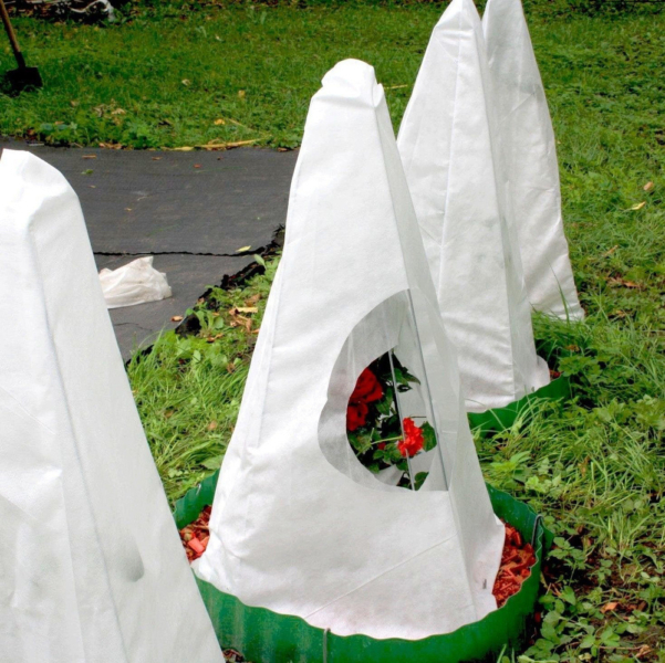 После засыпки любым из этих материалов основание куста необходимо надежно укрыть от осадков. Для этого поверх сухого слоя кладут кусок водонепроницаемого материала (плотная пленка, рубероид), оставив по бокам продухи для вентиляции, а затем восстанавливают основной каркас и внешний слой агротекстиля.