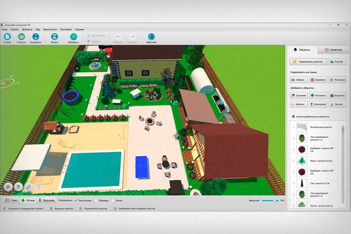Перечисленных недостатков лишен Ландшафтный Дизайн 3D. Это удобное приложение с интуитивно понятным интерфейсом. В программе вы сможете создавать участки с любой формой и площадью, настраивать их рельеф, добавлять постройки и зеленые насаждения.