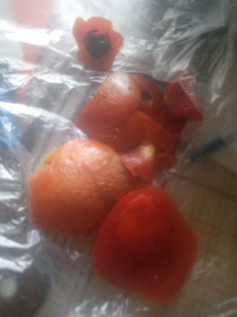 Собрала немного и решили сварить быструю аджику. Помидоры в этом году из-за палящего солнца слегка подпекаются снизу, есть на поверхности плодов и какие-то точки:
