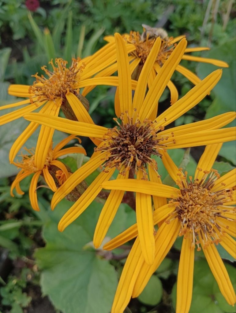 Не только я оценила красоту цветов, но и пчёлки, они просто облепляли жёлтые ромашки бузульника. Но разлетались, когда я подходила к лигулярии чтобы сфотографировать мой чудесный цветочек. Но были и очень смелые пчёлки, которые не обращали на меня внимания. Наверное, нектар очень вкусный.