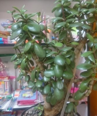 Я живу в деревне, и это просто здорово! Но сельский магазинчик выглядел как-то уныло. Вот я и подумала, а может подарить им цветок? У меня как раз был один лишний – денежное дерево. Этот цветок довольно большой по высоте – 54 см, он уже полностью взрослый и дарил мне немало своих “деток”. Вот какой он высокий: