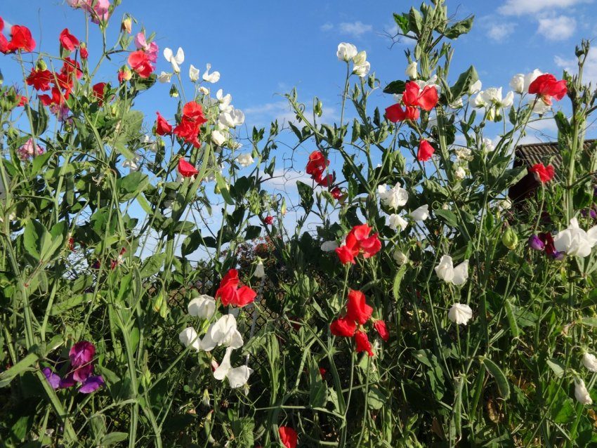 Первый раз цветы душистого горошка я посадила, чтобы прикрыть сетчатый забор от заброшенного, заросшего травой соседского участка. Плети быстро заплели сетку, цепляясь за ячейки своими усиками, а вскоре появились чудесные разноцветные, ароматные цветы.