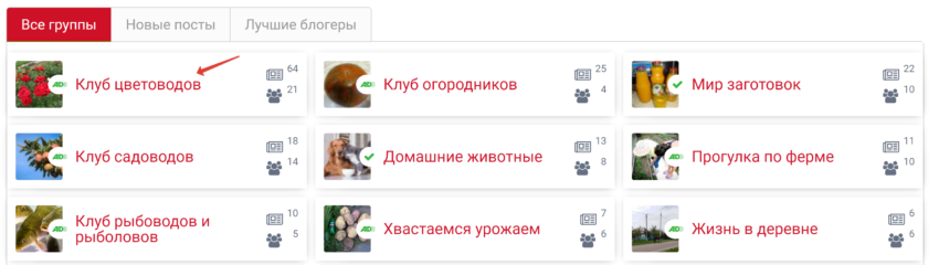 На странице вы увидите несколько вкладок: Все группы, Новые посты, Лучшие блогеры.