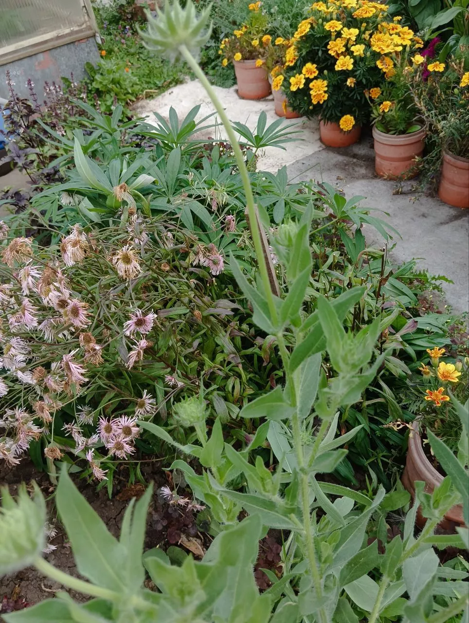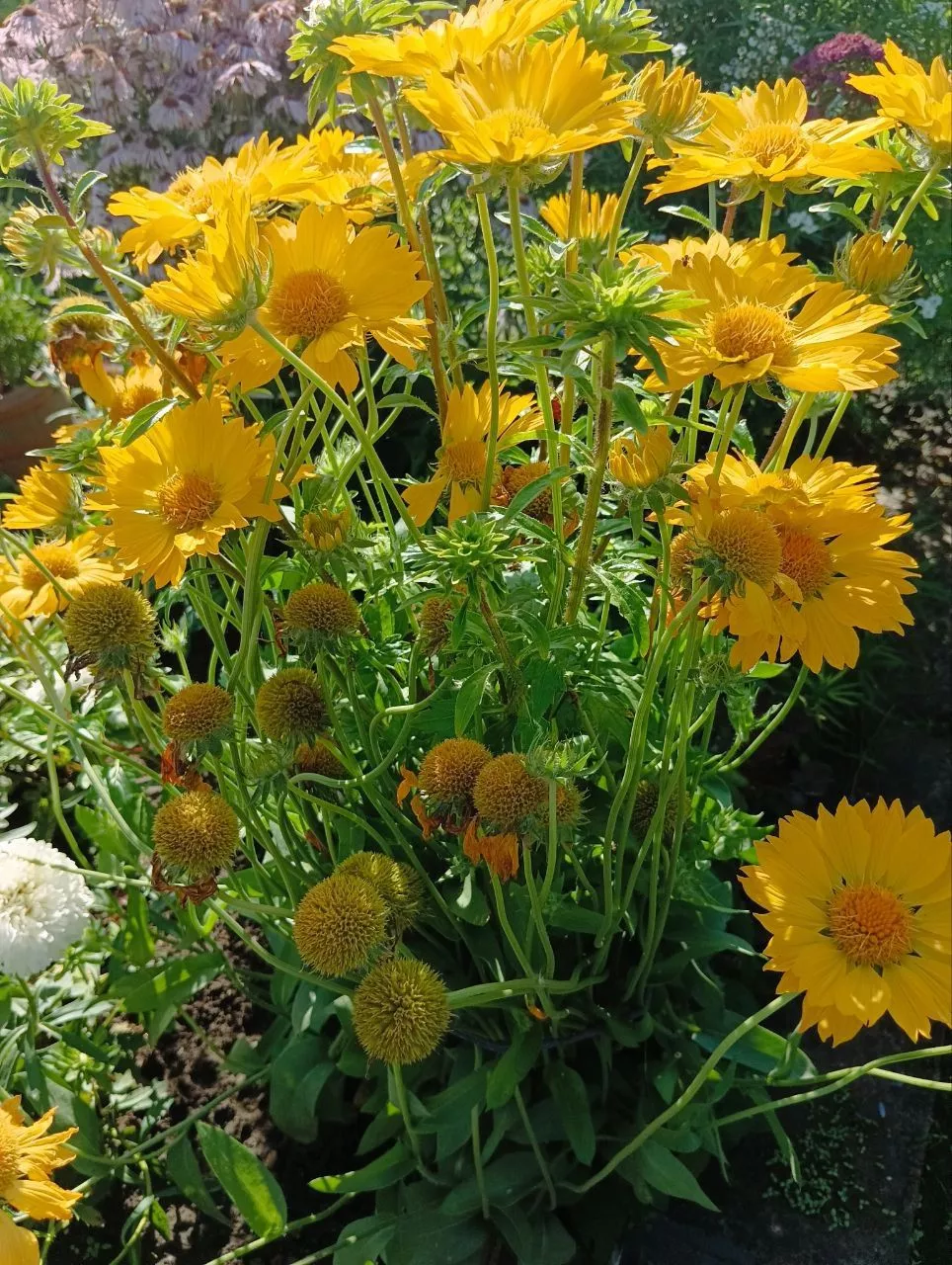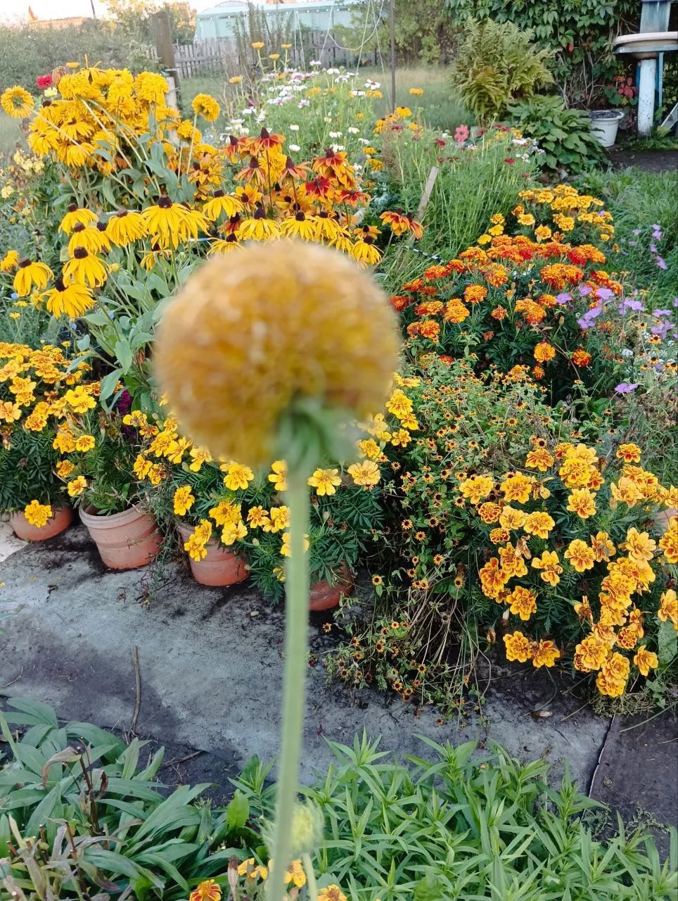 Когда покупаю семена взгляд останавливается на пакетиках с жёлтыми цветами. И в этом сезоне посадила несколько новых цветов жёлтого оттенка. Ирис болотный, два вида гелиопсиса, посеяла жёлтую эхинацею,календулу с лимонными махровыми цветами и золотой шар.Собирая грибы в лесу наткнулась на цветущий золотой шар.Он рос на краю лесной дороги,проезжающие машины просто наезжали на цветы и они поломанные лежали на земле. Конечно же, выкопала небольшой кустик.Как он туда попал неизвестно,скорее всего с расположенных рядом дач. Я очень обрадовалась мне золотой шар нравится, у меня он рос, но то ли вымерз,то ли вымок. А ведь когда-то он был очень популярный у дачников,его махровые солнечно-жёлтые цветы выглядывали из-за заборов.