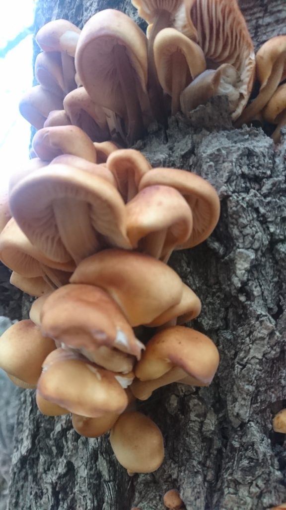 В начале ноября мне соседка задала вопрос – а грибы, которые растут на дереве, можно употреблять в пищу? Я ей ответила, что смотря какие. На что она отвела меня к себе во двор и показала эти грибы. Вот так они выглядят: