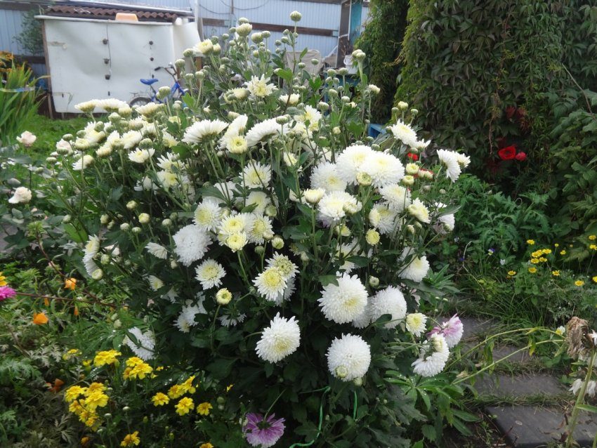 Часть высаженной весной рассады, совсем низкая, не успела подрасти и в эту осень не цвела. Мне всё равно нравятся мои новые хризантемы, хотя и ожидала от них большего-крупных цветов, ярких расцветок.