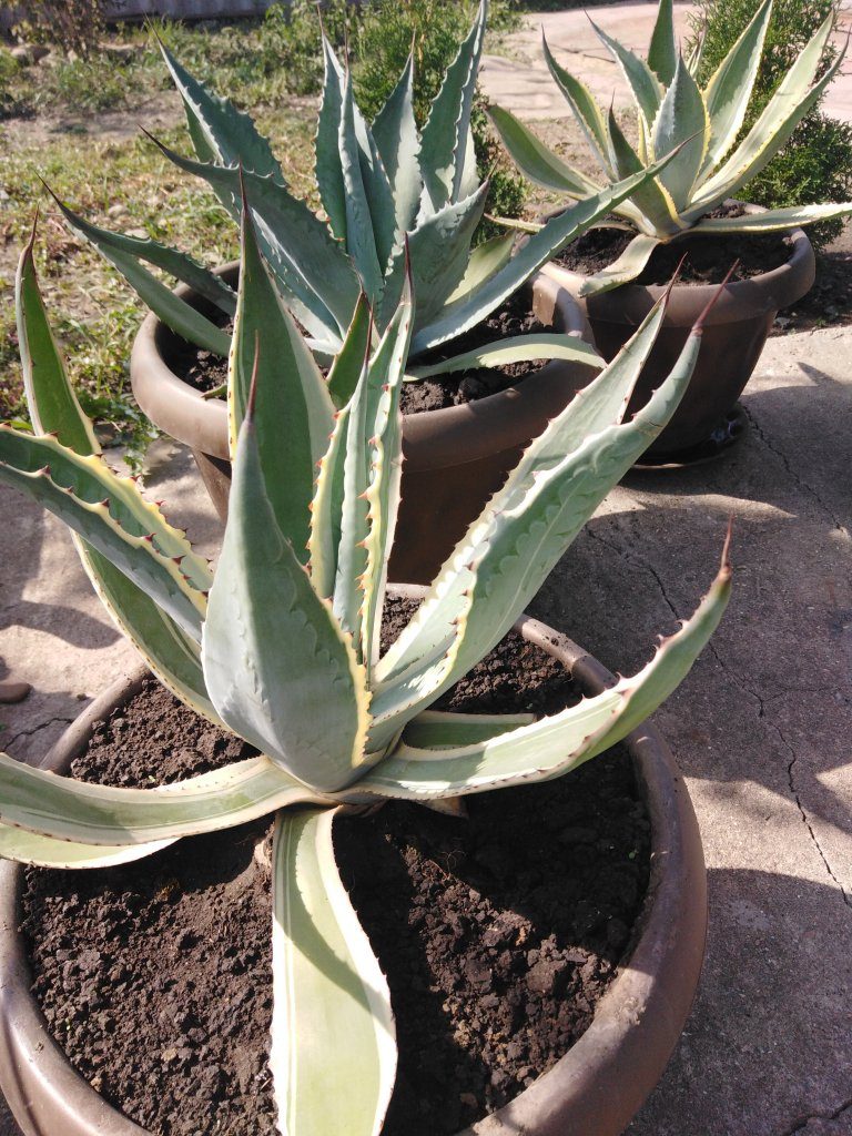 Вернёмся к нашей агаве… Соседка сразу посадила саженцы в большие горшки. Очень удобно — не нужно мучиться с пересаживанием и легко делать перестановку на участке. За год агава подросла, но обещанного прироста листвы в полметра не было.