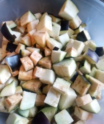 Я решила нарезать баклажаны кубиком. Это позволило сократить время приготовления, снизить уровень расхода масла и облегчить собственный труд. Итог – блюдо получилось такого же вкуса, но сами баклажаны – более сочными.