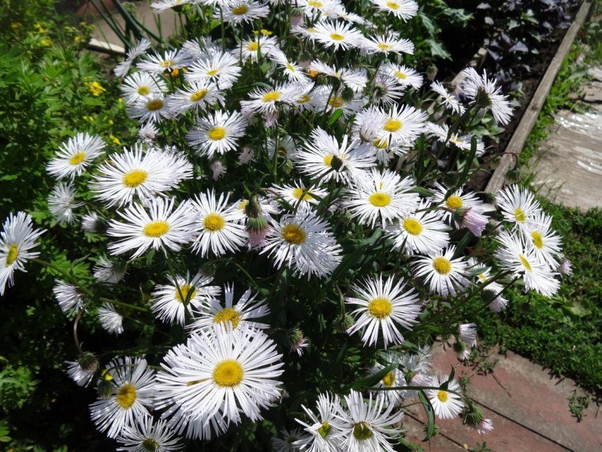 У меня когда-то рос эригерон альпийский, низкорослый многолетник с сиреневыми цветами, он остался на старой даче.
