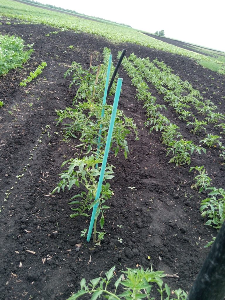 Я стараюсь высаживать разные сорта помидоров, чтобы и на консервацию, и на салаты и вообще для разнообразия. В этом году посадила низкорослый Взрыв и высокорослый Настя-сластёна. Первый должен вырасти максимум до 50-60 см, а второй – до 2 м. Все помидоры сажаю на одном расстоянии в одном ряду, но между Настей-сластёной и Взрывом выдерживаю дистанцию в 2 раза больше.