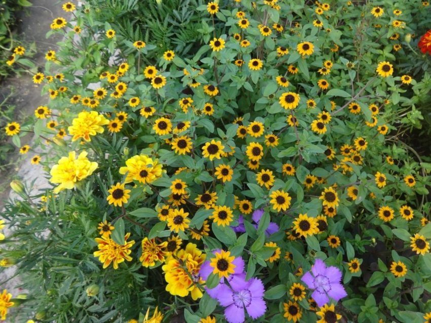 Санвиталия растёт быстро, вскоре она захватила большое пространство, её стебли перекинулись на горшки с бархатцами, растущими вдоль дорожки. Пришлось убирать часть горшков, переставлять в другое место.