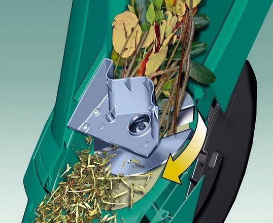 Щепа из такого шредера получается в виде крупных рубленных кусочков. - Турбинные – в этой модели ножей много и, вращаясь, они затягивают ветку и одновременно измельчают.