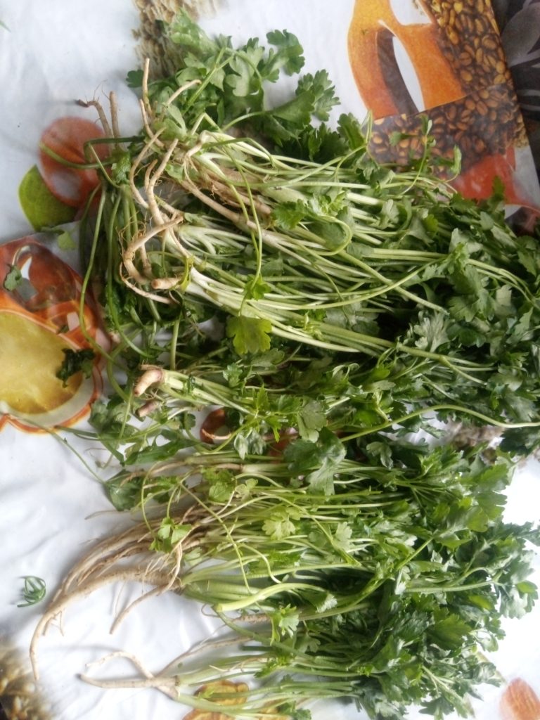 Ещё немного рано по срокам, поэтому петрушка, посаженная мною в огороде не выросла. Да и вообще, слабовато вылазит. Я купила на рынке вот такую зелень – её продавали вместе с корнями (если честно, не понимаю, зачем так вырывать, ведь из корней потом будет формироваться новая зелёная масса).