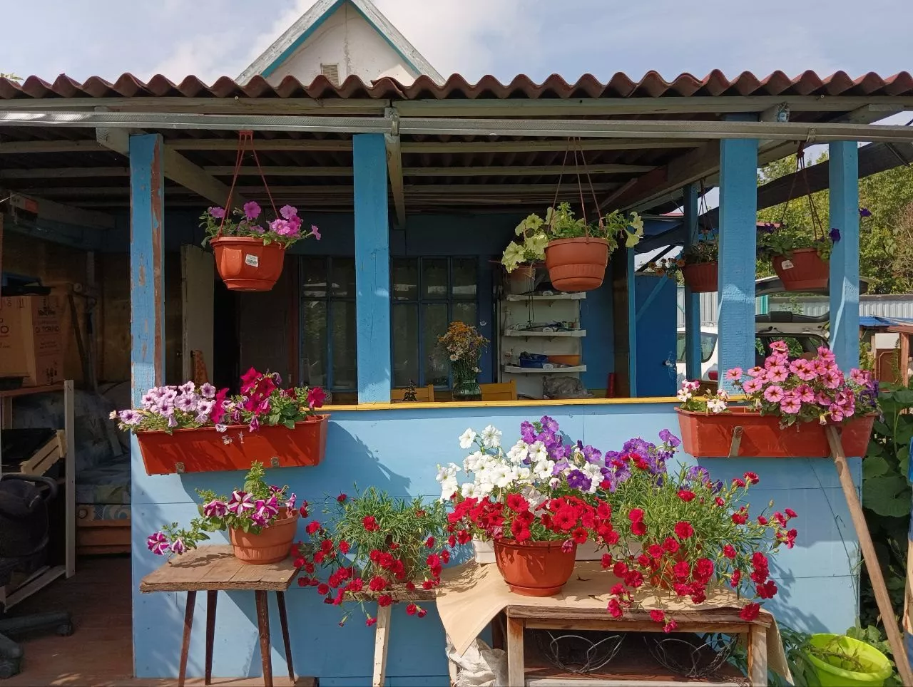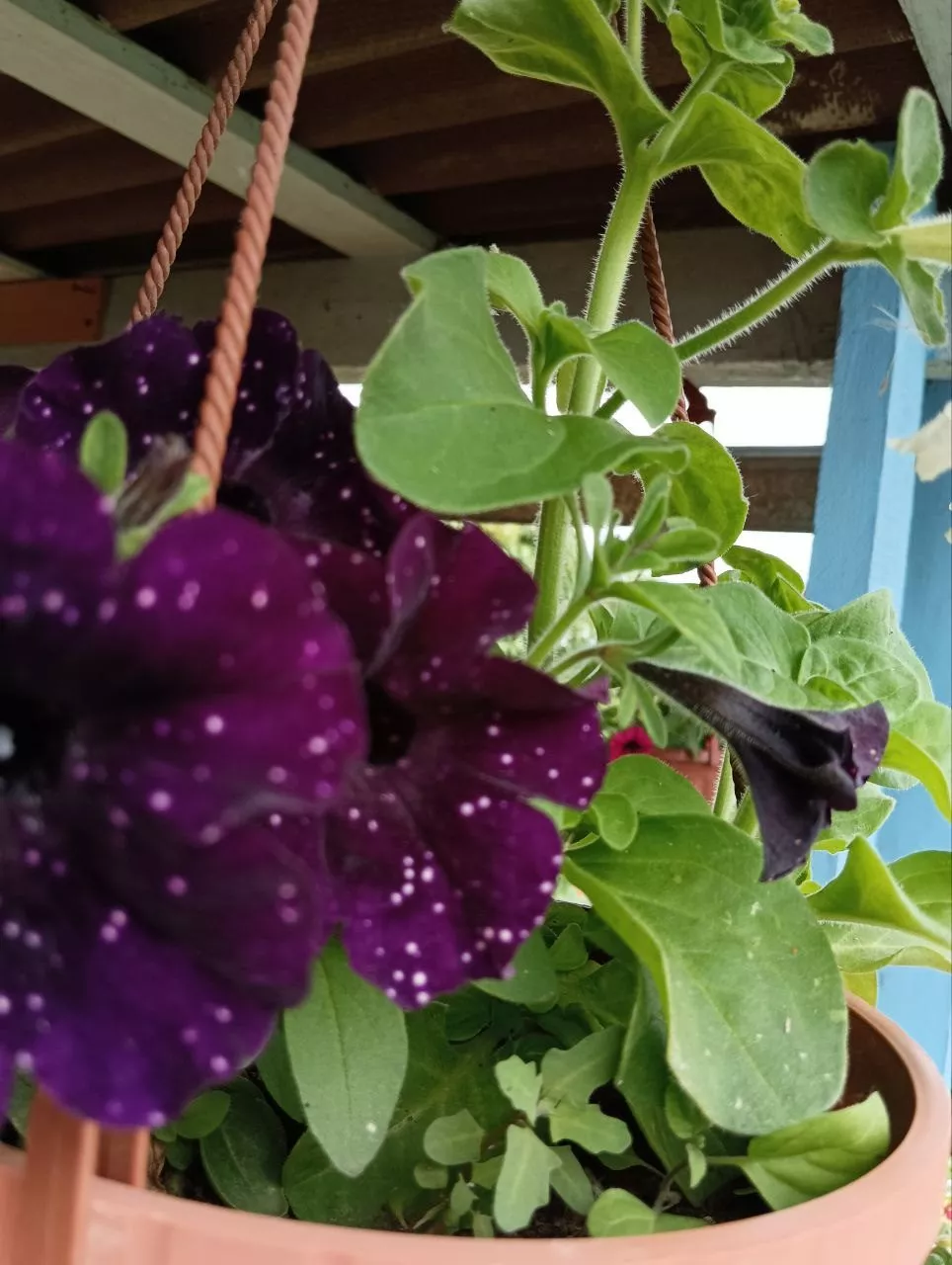 До середины июня петуньки стояли в теплице,так как у нас было очень холодно, днём всего 6-8 тепла, а по ночам небольшие заморозки.Когда погода наладилась мы украсили беседку уже хорошо цветущими петуниями.