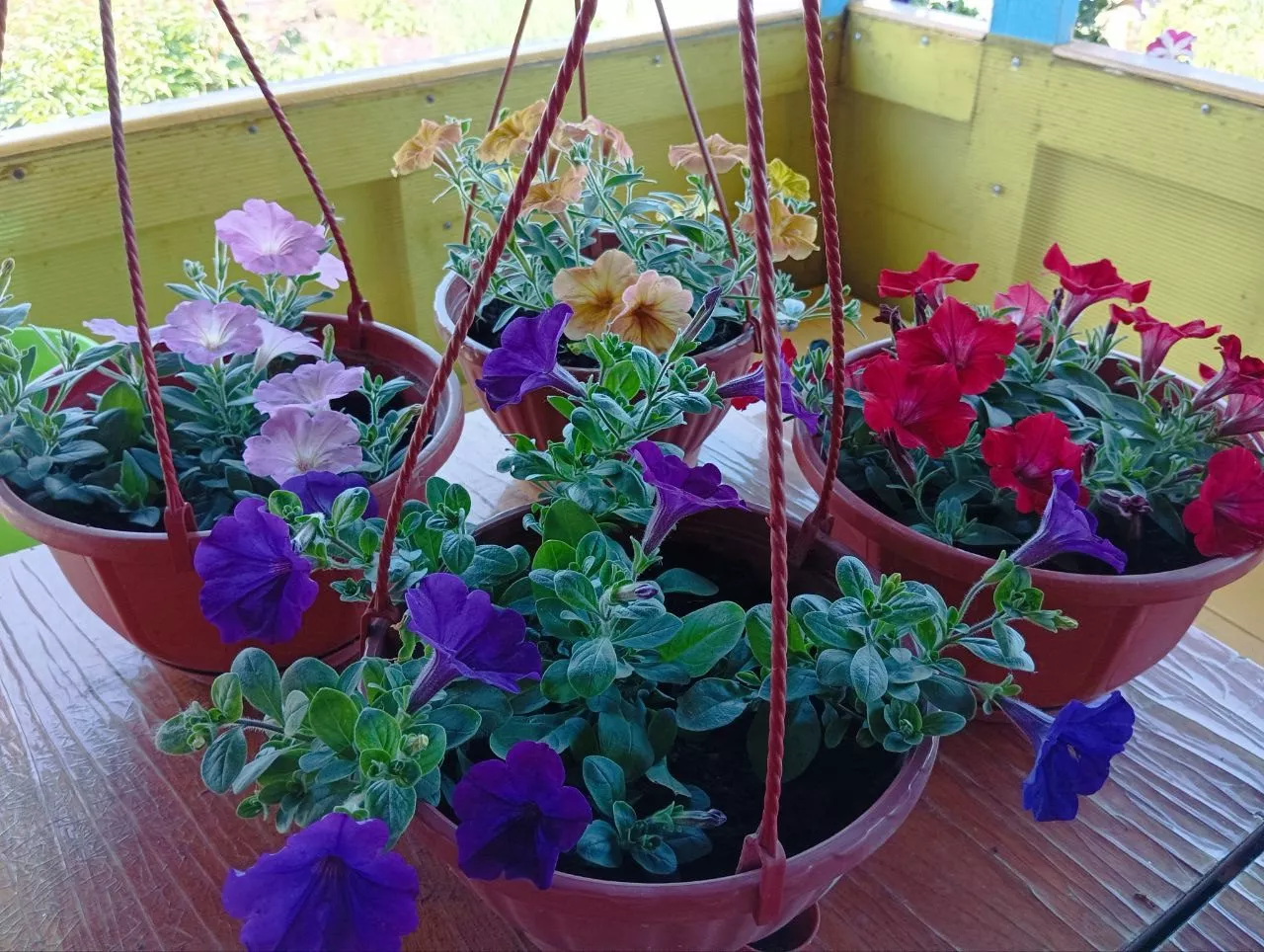 Цветочки росли в маленьких стаканчиках.Пересадила петунии в подвесные кашпо,в ящики, добавив в почву немного гранул азофоски,хорошо перепревший перегной.