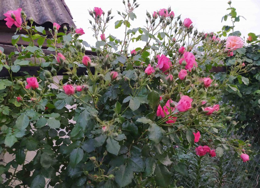 На фото вид на куст с крыльца с северной стороны – видно, что он весь в цвету. Тогда как рядом стоит зеленая стена без цветов роз Хендель и Полка.