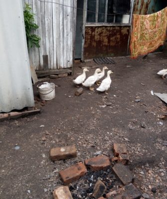 Естественно, выводим их гулять во двор, который находится возле огорода – пусть щиплют травку свежую, уничтожают сорняки.