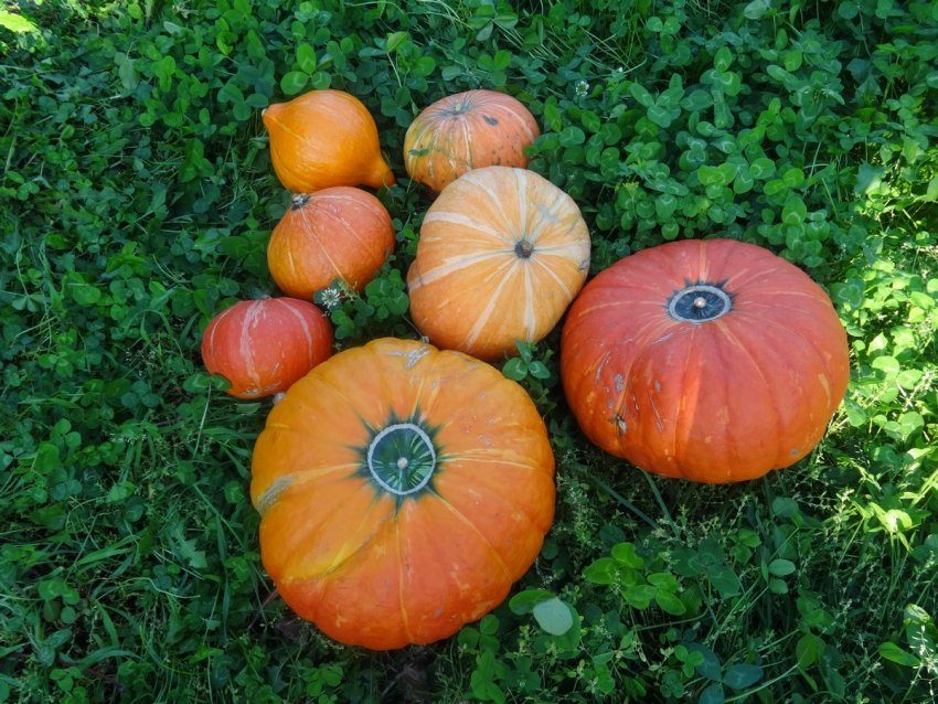 Собрали небольшой урожай тыквы. Часть тыквы ещё на огороде, они не пожелтели, зелёного цвета.