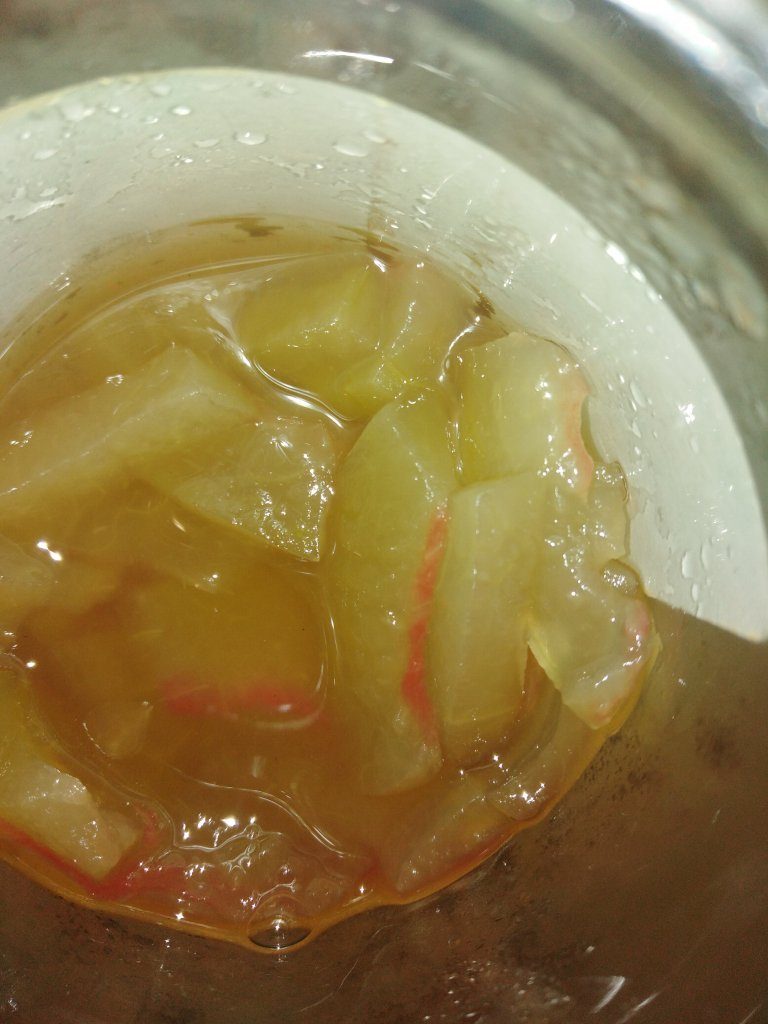 К этому времени корки дали сок, и консистенция изменилась на жидкую. Сами брусочки стали прозрачного золотистого цвета. Они будто плавали в меду.