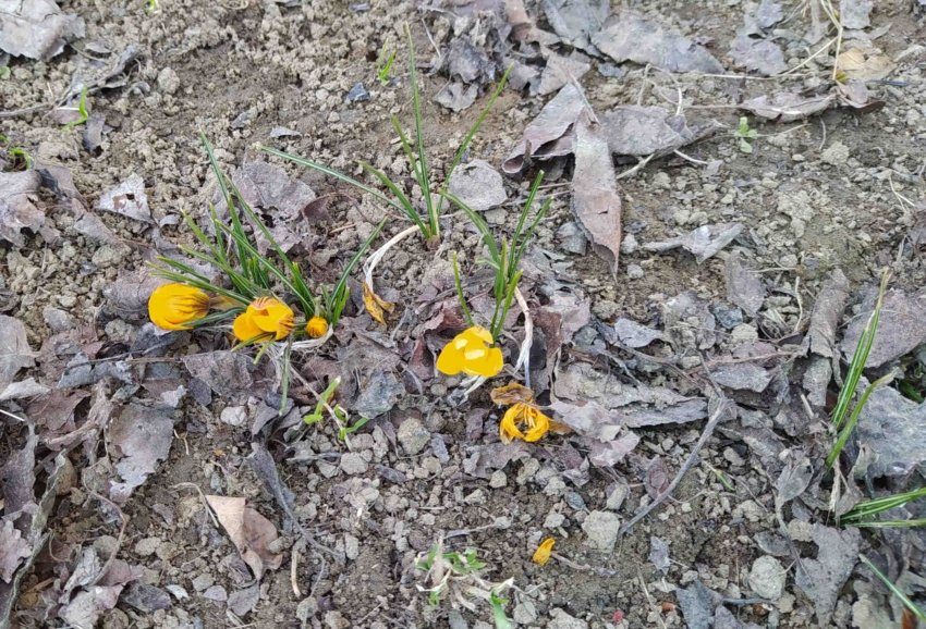 Уже расцветают первые весенние цветы, крокусы, подснежники, морозник. Показали из земли листья тюльпаны и нарциссы.