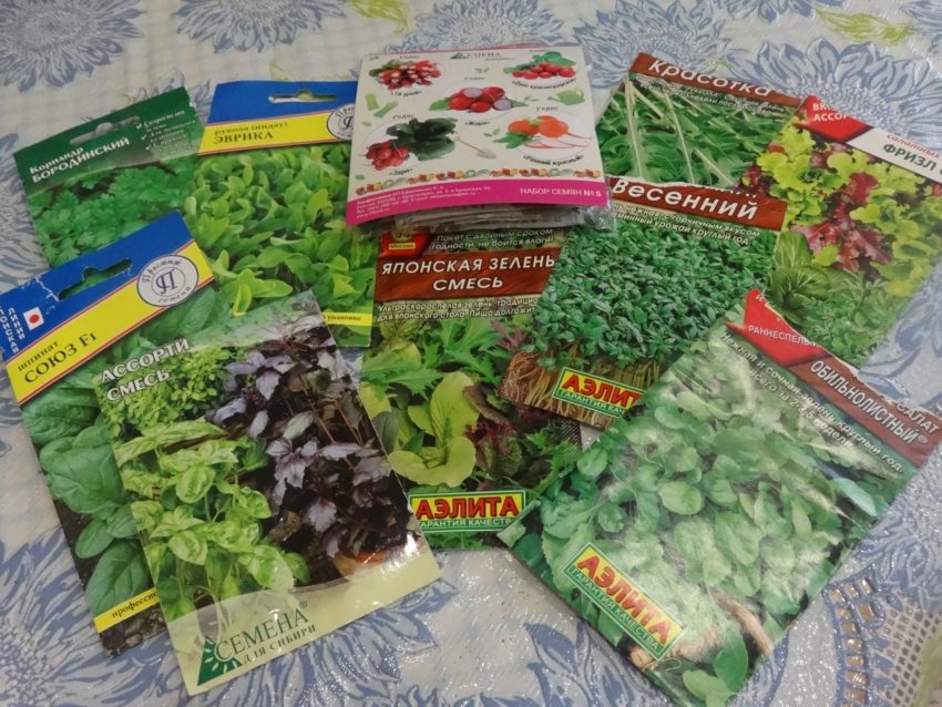 Листовые салаты — Обжорка, Изумрудное кружево, смесь салатных культур-Фризл Сизл, в которую входят такие культуры как салаты Тайфун, Кармен, кресс — салат Ванька кучерявый, индау сорт Худей вкусно, капуста китайская Краса востока, горчица сарептская Частушка.
