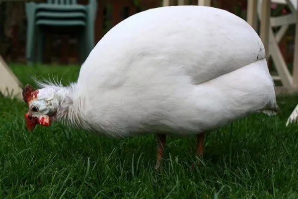 Сибирские белые цесарки отличаются от своих серо-крапчатых сородичей не только цветом оперения. У них совсем светлые, с розовым оттенком лапы и кожа. Птицы в каком-то смысле считаются альбиносами.