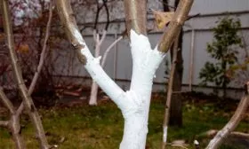 Побелку деревьев проводят ежегодно с 15 октября по 15 ноября в сухую погоду. Вы можете купить готовый раствор для побелки или создать его самостоятельно, смешав: