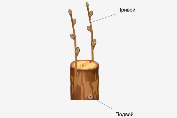 - В виде привоя используйте черенки, у которых есть 5 мощных почек. Заточите нижнюю часть под колышек на глубину расщепа.