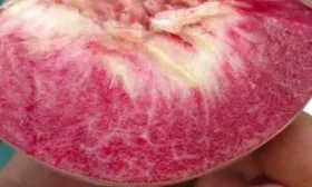 Главная отличительная черта – цвет мякоти. Она обладает глубоким, насыщенным темно-красным окрасом, который равномерно распределен от кожицы до самой косточки. Консистенция мякоти нежная, мясистая и очень сочная.