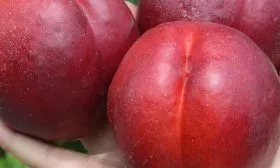 Подкожные точки на этом фоне почти не видны. Форма плода правильная, округлая, иногда может наблюдаться легкая асимметрия или слабовыраженная овальность. Размер впечатляет — нектарины массой 150-200 граммов выглядят на ветке как небольшие яблоки.