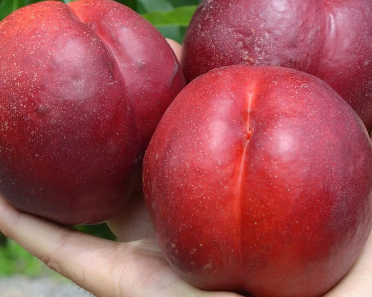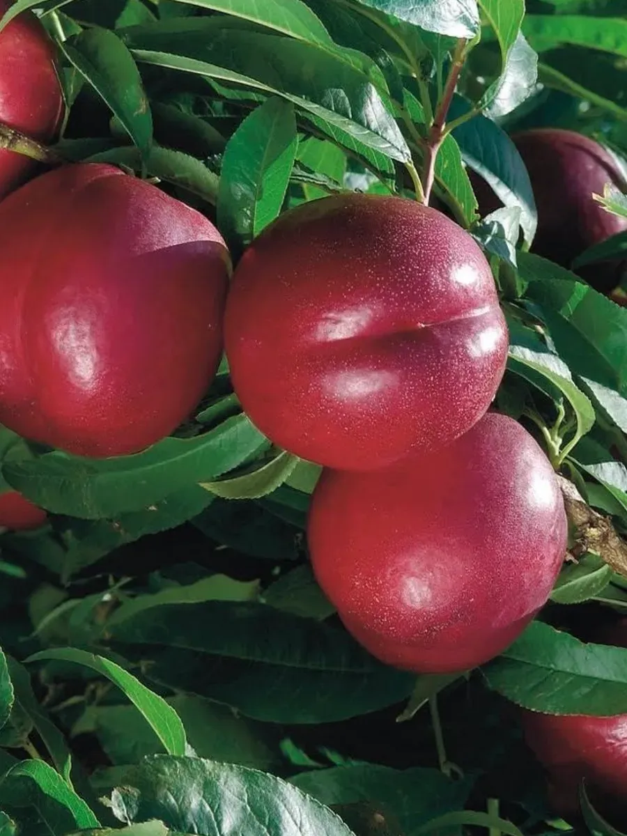 Внешность плодов — визитная карточка сорта. Его легко узнать по уникальной, очень насыщенной окраске. Практически вся поверхность покрыта густой вишнево-фиолетовой, иногда почти чернильной, кожицей с характерным глянцевым блеском. Такой равномерный и глубокий цвет — отличительная черта Биг Топа, которая редко встречается у других нектаринов.
