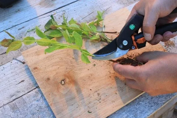 Приступайте к мероприятию в июле. Выберите молодой побег длиной около 30 см и разделите его на части с 4 листочками. Верхний срез делайте ровным, нижний – косым. Поместите заготовки на сутки в стимулятор роста, затем высадите в подготовленную почву и накройте плёнкой. Через 1,5 месяца пересадите на постоянное место.