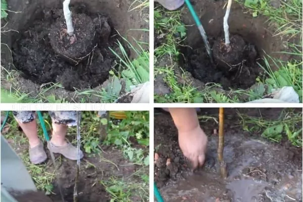 - В центр углубления уложите субстрат для посадки, установите саженец, аккуратно распределяя корневые отростки.