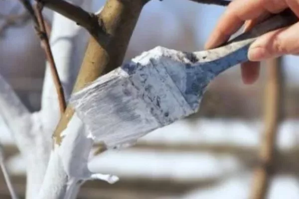 Изначально нужно обработать ствол и крупные ветви белой краской или известью, а также защитить нижнюю часть дерева с помощью металлической сетки от нападений грызунов.