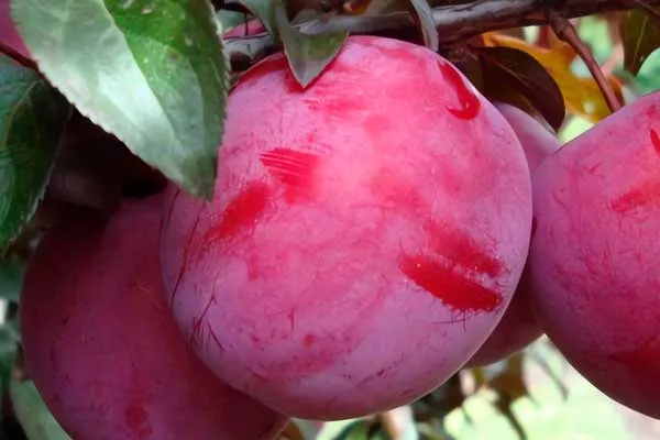 - Цвет фруктов насыщенный красный, отмечен множеством мелких точек под кожей, а также незначительным восковым покрытием. При созревании сливы отделяются от дерева без проблем и не распадаются.