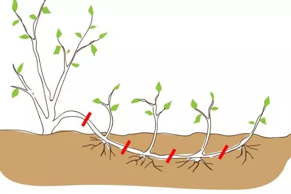 - Отводками. Выберите здоровый, гибкий побег, пригните его к земле. Присыпьте грунтом, оставив верхушку на поверхности. Укоренение происходит в течение одного-двух сезонов, после чего отводок отсоедините от основного растения и пересадите на постоянное место.