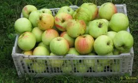 Работы проводят исключительно в сухую погоду. Начинать лучше с нижних ветвей, постепенно перемещаясь к верхним. Плод обхватывают всей ладонью, надавливая указательным пальцем на плодоножку у места прикрепления к плодушке, и с поворотом вокруг оси снимают. Старайтесь сохранить плодоножку и ни в коем случае не отрывайте ее от яблока — это открывает ворота для инфекций.