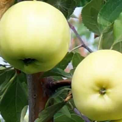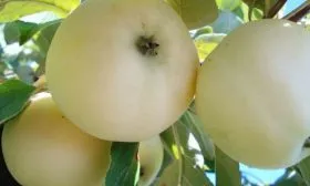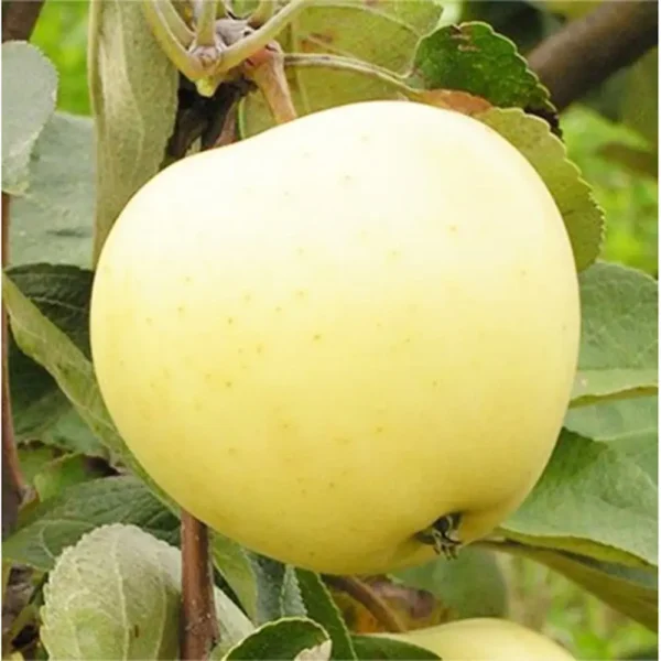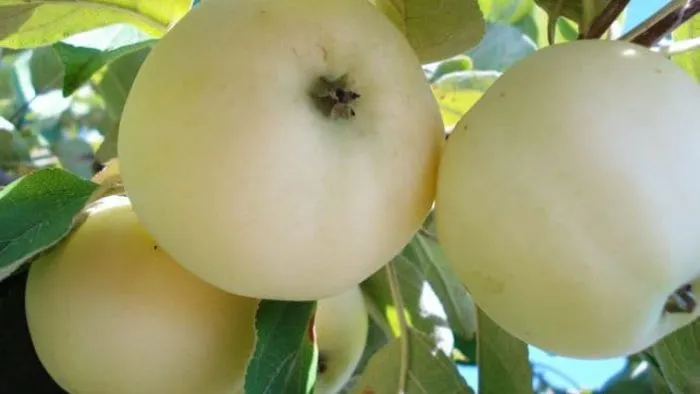 Плоды являются наиболее узнаваемой чертой сорта. Их внешний вид полностью соответствует названию. Основная окраска кожицы – беловатая, без какого-либо выраженного покровного румянца, что делает яблоки визуально светлыми, почти фарфоровыми. Поверхность гладкая, но на ощупь кожица может казаться слегка грубоватой. Она имеет тусклый, матовый оттенок и часто покрыта тонким естественным сизоватым налетом (пруином), который легко стирается при прикосновении.