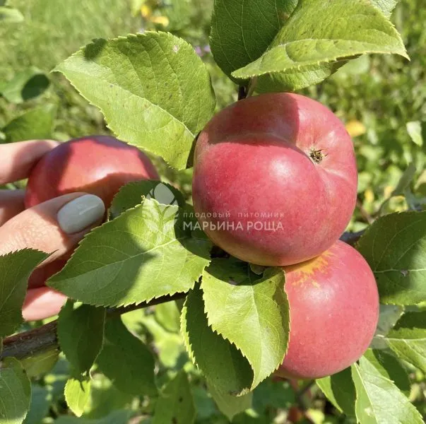 Плоды отличаются выровненностью по размеру и классической плоскоокруглой формой. Визуальная привлекательность – одно из ключевых достоинств. Основной зеленовато-желтый фон при съемной зрелости почти полностью скрыт под яркой, размытой покровной окраской насыщенного красного цвета. Прочная, но не грубая кожица с легким восковым налетом обеспечивает естественную защиту и отличную транспортабельность.