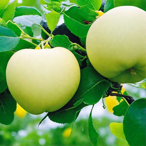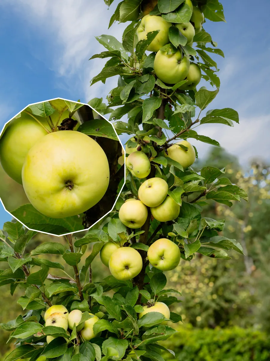 Поверхность защищена естественным восковым налетом (пруином), который придает матовый оттенок. Этот слой не только слегка предохраняет яблоко от внешних воздействий и испарения влаги, но и является сортовым признаком. Мякоть белоснежная, что особенно ценится в кулинарии, и обладает плотной, хрустящей структурой. Высокая сочность — еще одна ключевая характеристика, подтверждающая качество плода.