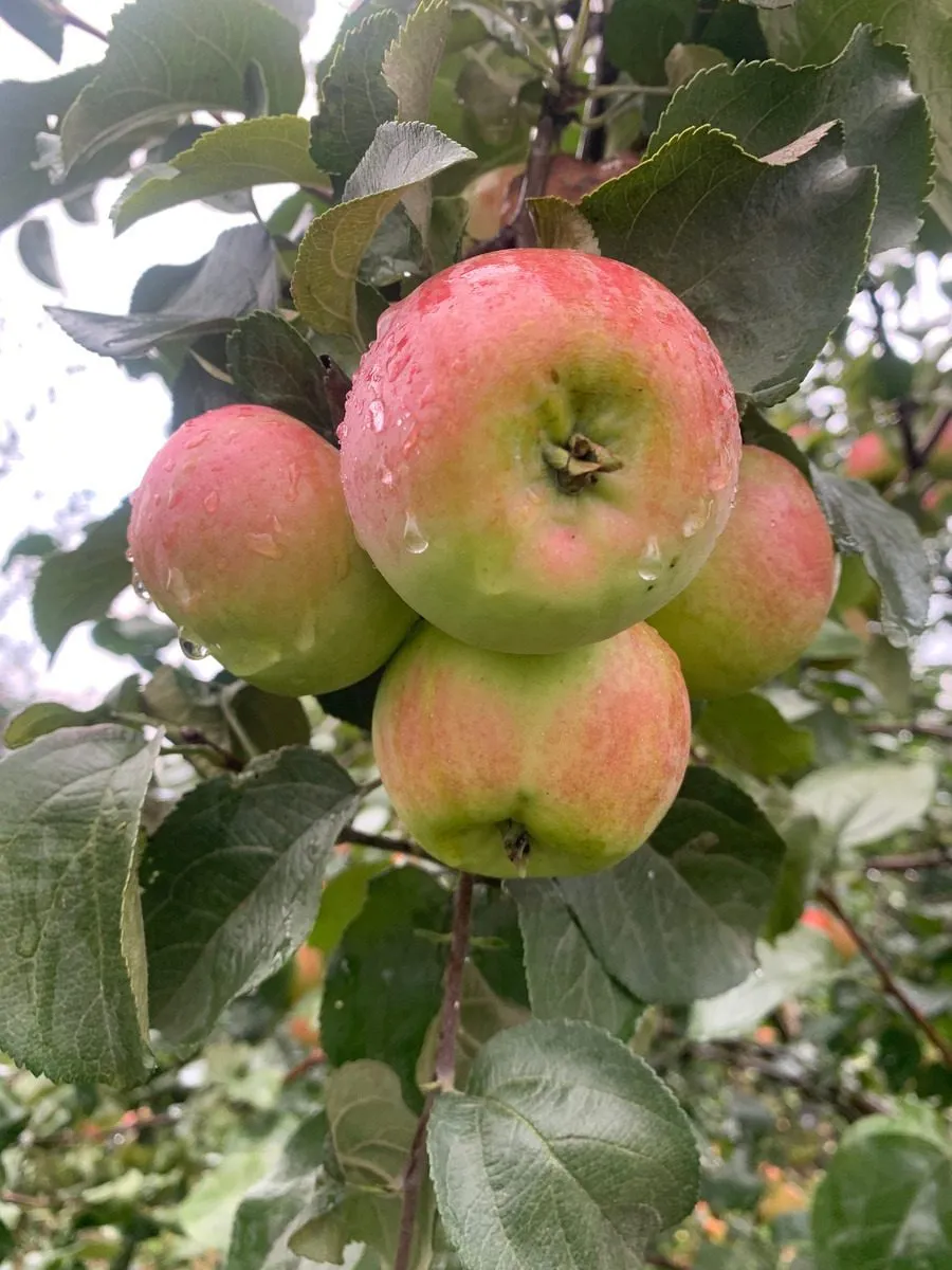 Этот румянец имеет сложный, «живописный» характер: он проявляется не сплошным пятном, а в виде многочисленных полосок, штрихов и точек на размытом фоне. Благодаря такому рисунку каждый плод выглядит уникально. Кожица у яблок тонкая и нежная, с ощутимым маслянистым налетом, который легко стирается при прикосновении.