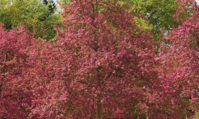 Внешний вид этой декоративной яблони меняется в течение года, создавая постоянно обновляющуюся картину в саду. Весной дерево буквально утопает в облаке крупных, ароматных цветов насыщенного пурпурно-розового оттенка. Этот эффектный наряд держится достаточно долго, что является важным достоинством для декоративного растения.