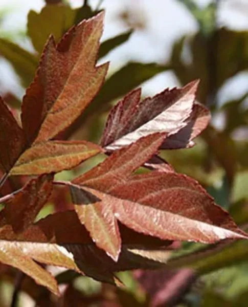 После цветения раскрывается еще одна сильная сторона сорта — листва. Молодые листья имеют свекольно-красный цвет, который к середине лета переходит в темно-зеленый с выраженным бронзово-пурпурным отливом. Именно эта благородная, стабильная окраска листвы высоко ценится в ландшафтном дизайне, так как сохраняется до глубокой осени.