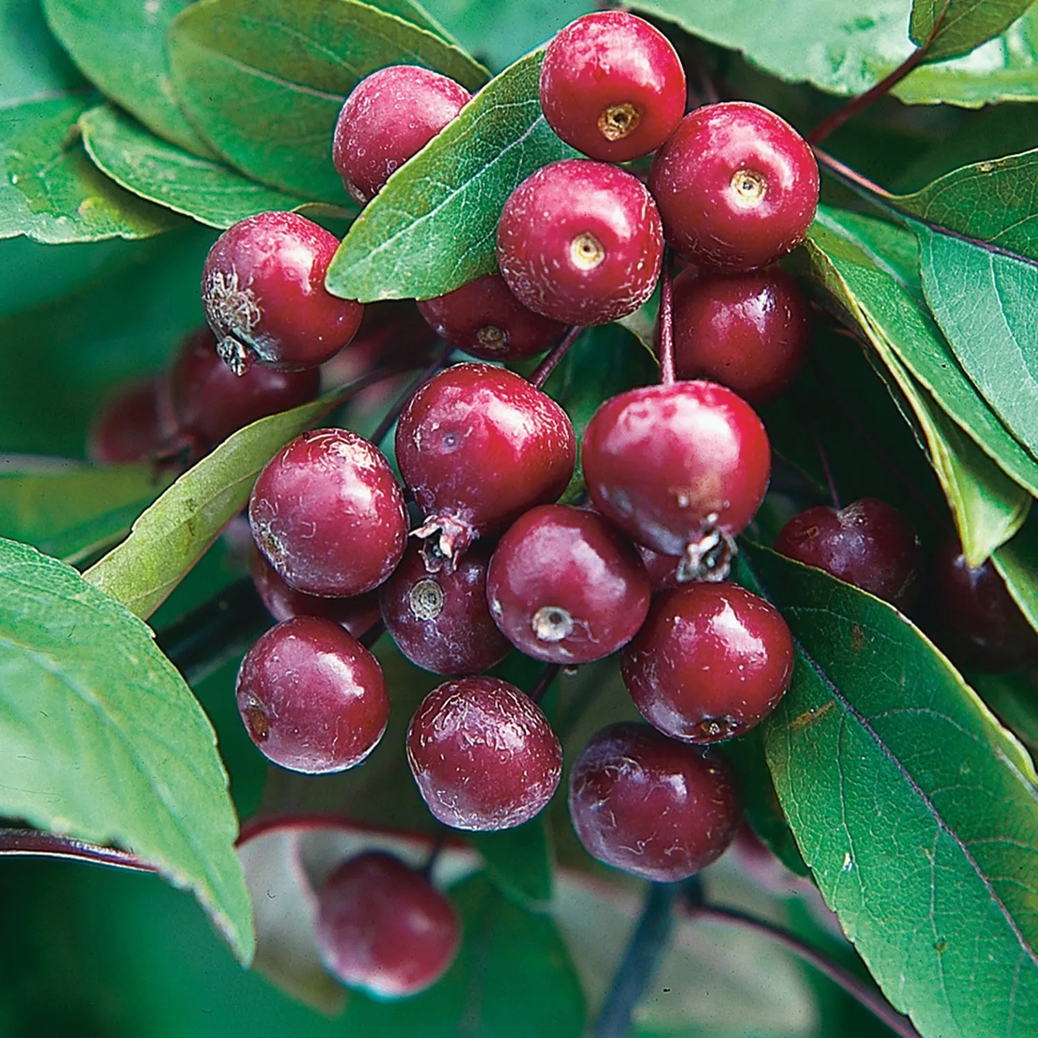 Плоды у этого сорта, согласно характеристикам, мелкие. Их окраска — равномерная, глянцевая пурпурно-красная. Они густо усыпают ветви, создавая впечатление, что дерево украшено бусами, и долго не осыпаются после созревания, продлевая декоративный период.