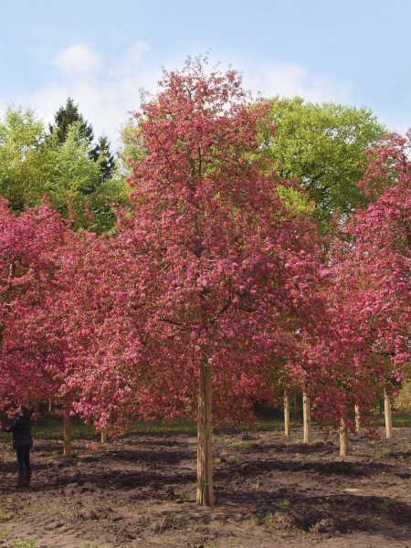 Внешний вид этой декоративной яблони меняется в течение года, создавая постоянно обновляющуюся картину в саду. Весной дерево буквально утопает в облаке крупных, ароматных цветов насыщенного пурпурно-розового оттенка. Этот эффектный наряд держится достаточно долго, что является важным достоинством для декоративного растения.