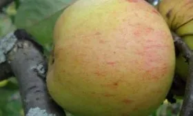Форма плодов округло-коническая, классическая для многих зимних сортов. Внешний вид очень нарядный благодаря контрастной окраске: светло-желтый основной фон практически наполовину перекрыт интенсивным темно-малиновым румянцем. Чаще всего он проявляется в виде размытых полос, что создает живописный эффект.