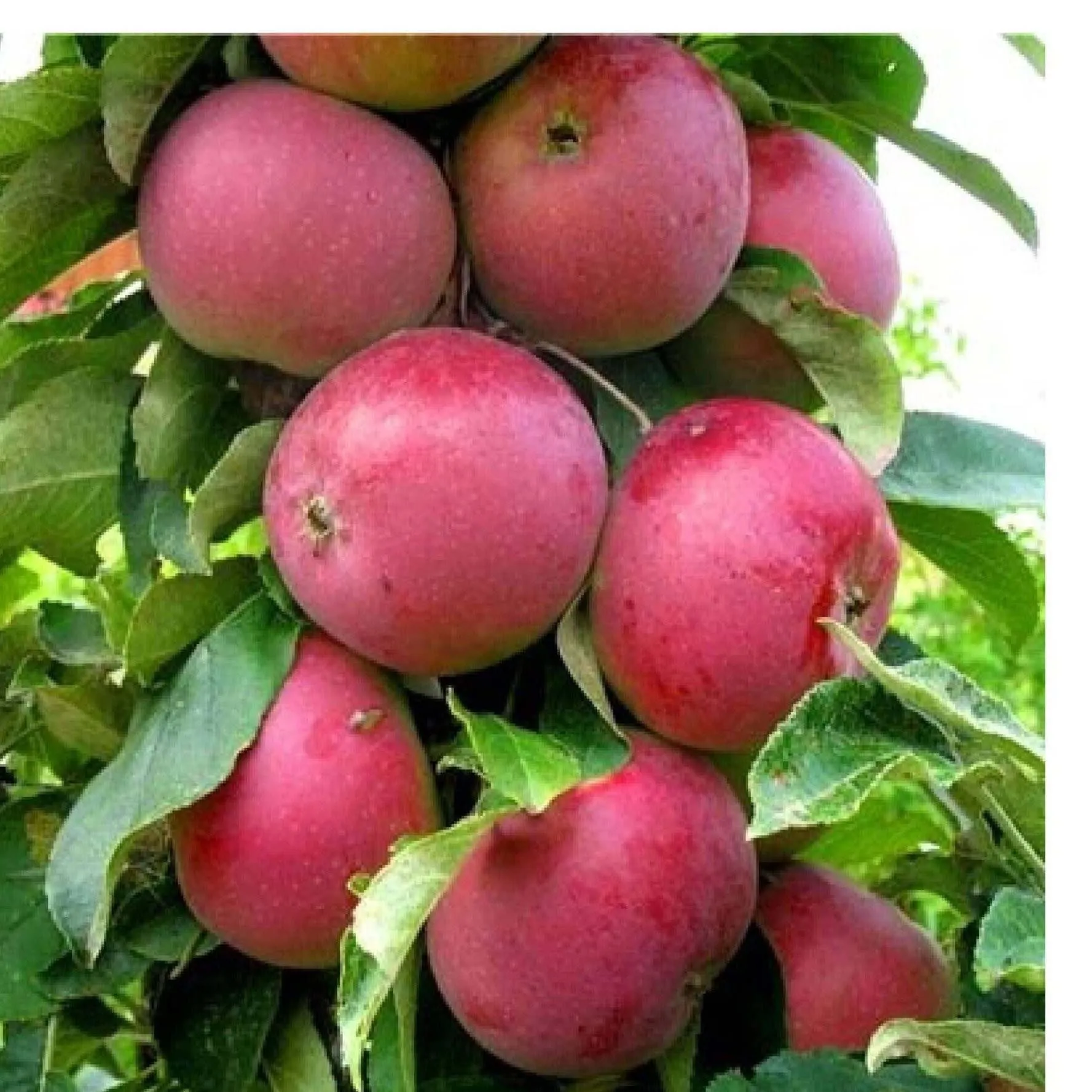 Визуально этот сорт легко отличить от классических яблонь. Его габитус (форма кроны) полностью соответствует колонновидному типу роста. Дерево напоминает стройный, плотный столбик, густо покрытый листвой и плодами по всей длине ствола.