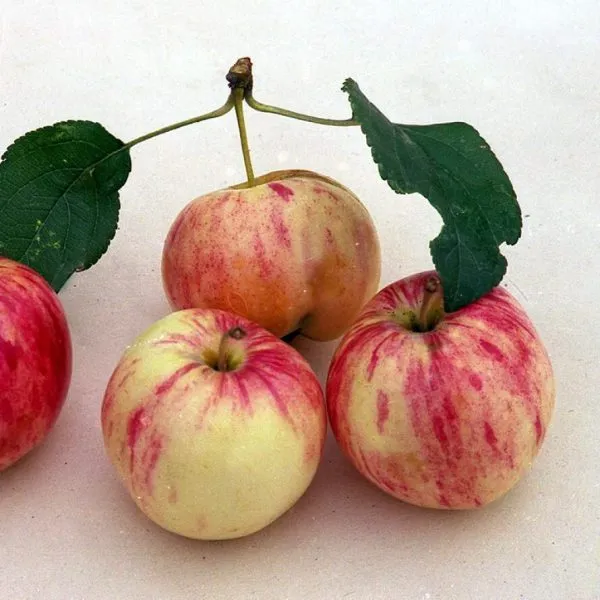 Окраска плодов очень декоративна и служит сортовой особенностью. Основной цвет — беловатый или кремовый. На этом фоне проявляется нежный, размытый румянец в виде розовых полосок и крапин, который выглядит как акварельный рисунок. Такой окрас — характерный признак, позволяющий отличить этот сорт от других раннелетних яблонь.