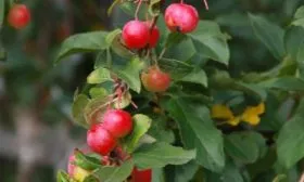 Настоящая декоративная кульминация наступает с приходом осени. На фоне меняющей цвет листвы созревают многочисленные плоды. Они действительно небольшие, что является характерной видовой особенностью многих декоративных яблонь. Главный акцент — их окраска. Яблочки приобретают яркую, чистую оранжево-красную палитру, которая выглядит особенно солнечно в осеннем саду.